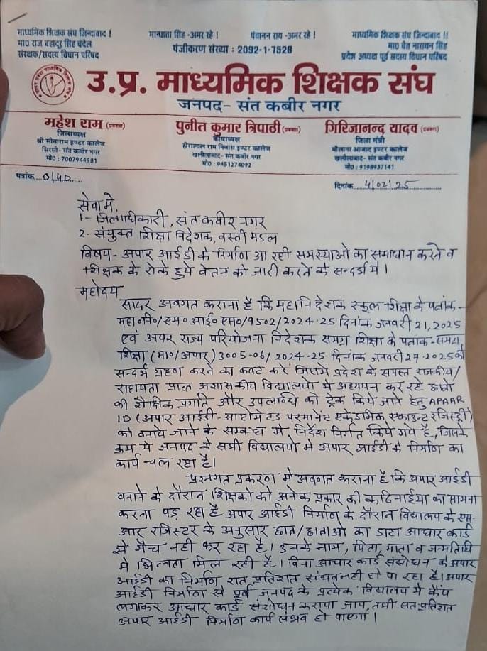संतकबीरनगर। माध्यमिक शिक्षकों के लिए अपार आईडी (ऑटोमेटड परमानेंट एकेडमिक एकाउन्ट रजिस्ट्री) सिर दर्द बन गया है। तकनीकी खामियों की वजह से शिक्षकों को अपार आईडी के निर्माण में कठिनाई हो रही है। कठिनाइयों का निवारण किए बिना वेतन रोक देने से माध्यमिक शिक्षक भड़क गए हैं। मंगलवार को नाराज शिक्षक जिलाधिकारी व जिला विद्यालय निरीक्षक से मिलकर व रुके हुए वेतन के तुरंत भुगतान की मांग की है। भुगतान न होने पर उत्तर प्रदेश माध्यमिक शिक्षक संघ ने आंदोलन की चेतावनी दी है।