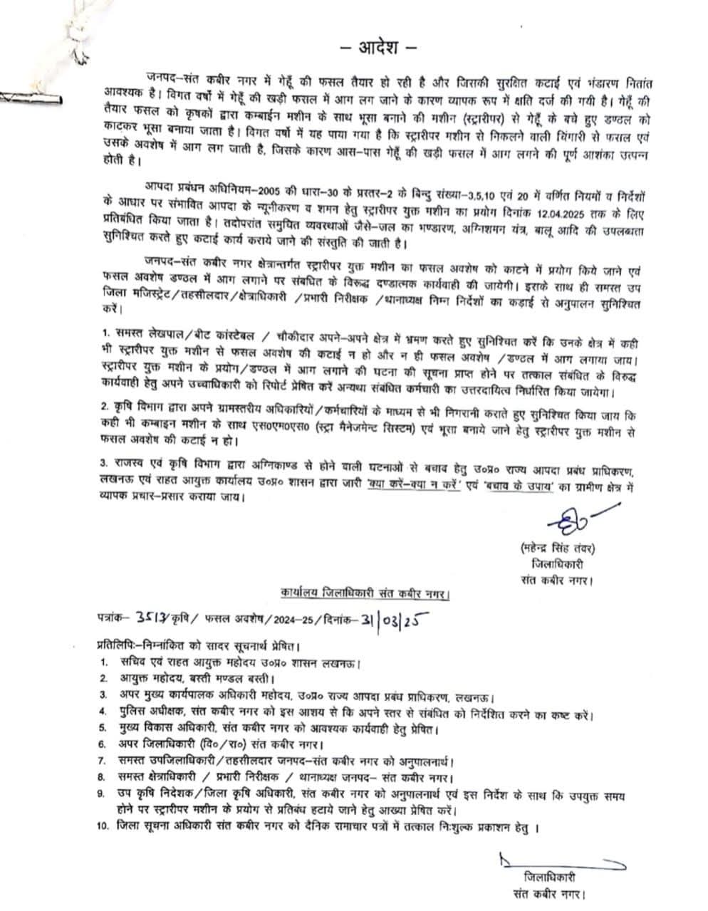 उन्होंने बताया कि जनपद-संत कबीर नगर क्षेत्रान्तर्गत स्ट्रारीपर युक्त मशीन का फसल अवशेष को काटने में प्रयोग किये जाने एवं फसल अवशेष डण्ठल में आग लगाने पर संबधित के विरूद्ध दण्डात्मक कार्यवाही की जायेगी। उन्होंने समस्त उप जिला मजिस्ट्रेट/तहसीलदार/क्षेत्राधिकारी/प्रभारी निरीक्षक/थानाध्यक्ष को उक्त निर्देशों का अनुपालन कड़ाई से सुनिश्चित करने हेतु निर्देशित किया है।
