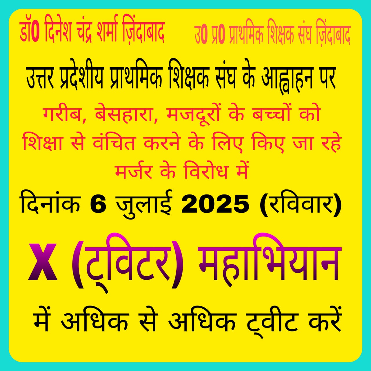 संतकबीरनगर।उतर प्रदेशीय प्राथमिक शिक्षक संघ के आह्वान पर रविवार के दिन जनपद के सभी नौ ब्लाकों के शिक्षकों ने विद्यालय मर्जर के विरोध में ट्विटर अभियान में हिस्सा लिया।एक बजे से शुरू इस अभियान में जनपद के सैकड़ों शिक्षकों ने हिस्सा लिया।एक्स पर रविवार के दिन # जस्टिस फॉर स्कूल चिल्ड्रन नंबर एक ट्रेडिंग पर रहा।