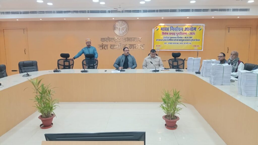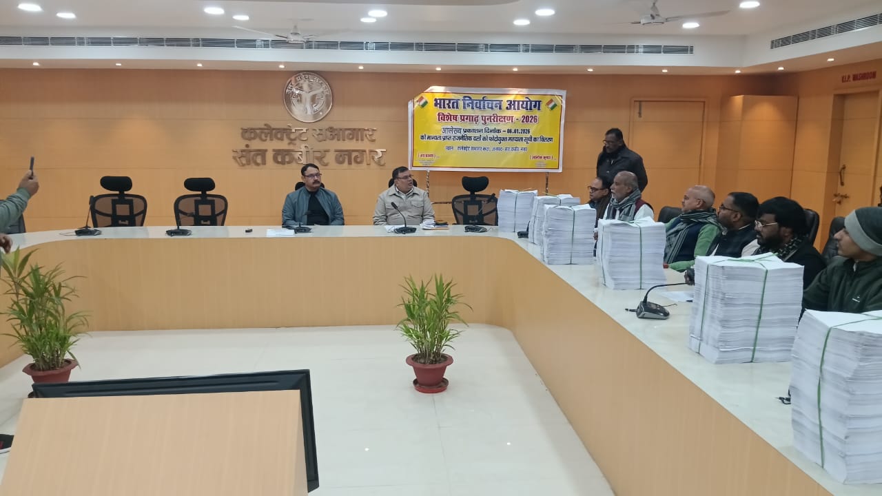 संत कबीर नगर 06 जनवरी, 2026(सू0वि0)। जिला निर्वाचन अधिकारी/जिलाधिकारी आलोक कुमार की अध्यक्षता में विशेष प्रगाढ़ पुनरीक्षण-2026 के क्रम में राजनैतिक दलों के पदाधिकारियों के साथ कलेक्ट्रेट सभागार में आयोजित बैठक में जनपद के विधानसभा निर्वाचन क्षेत्रों की फोटोयुक्त निर्वाचक नामावलियों का आलेख्य प्रकाशन किया गया। इस अवसर पर उप जिला निर्वाचन अधिकारी/अपर जिलाधिकारी (वित्त व राजस्व) जयप्रकाश उपस्थित रहे।