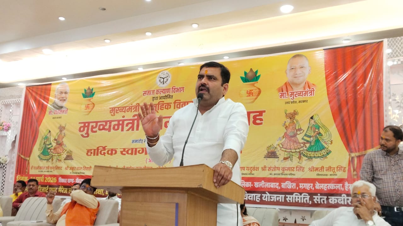 मा0 विधायक खलीलाबाद अंकुर राज तिवारी ने मुख्यमंत्री सामूहिक विवाह योजनान्तर्गत आयोजित सामूहिक विवाह कार्यक्रम में उपस्थित मा0 जनप्रतिनिधिगण, प्रशासनिक अधिकारीगण, मीडिया बन्धु सहित सामूहिक विवाह कार्यक्रम में उपस्थित समस्त अभिभावकगण, वर-वधू एवं सम्मानिक आगन्तुकगणों का हार्दिक स्वागत करते हुए सामूहिक विवाह कार्यक्रम के भव्य आयोजन पर सभी को हार्दिक शुभकामनाएं एवं धन्यवाद दिया। उन्होंने अपने सम्बोधन में मा0 मुख्यमंत्री योगी आदित्यनाथ जी का हार्दिक आभार व्यक्त करते हुए कहा कि मुख्यमंत्री सामूहिक विवाह योजनान्तर्गत आज बिना किसी जाति धर्म के भेदभाव से हर गरीब के बेटियों की शादी सम्पन्न करायी जा रही है। उन्होंने कहा कि बेटियों की आकान्क्षाओं को पूरी करने की दिशा में प्रदेश सरकार द्वारा बेटी पैदा होने से लेकर शादी होने तक की जिम्मेदारी प्रदेश सरकार विभिन्न योजनाओं के माध्यम से स्वंय वहन कर रही है।