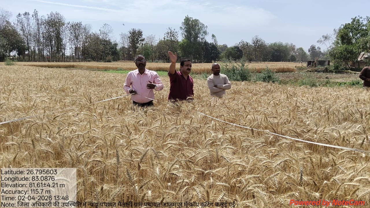 संत कबीर नगर 02 अप्रैल 2026 (सूचना विभाग)। जिलाधिकारी आलोक कुमार के निर्देश के क्रम में तहसीलदार खलीलाबाद आनंद ओझा द्वारा तहसील खलीलाबाद के विकासखंड खलीलाबाद के ग्राम पंचायत आजमपुर में रबी 2025-26 के अंतर्गत चयनित कृषक कृष्ण सिंह के स्थित गाटा संख्या 74 रबी कटिंग की अधिसूचित फसल गेहूं की कटाई का CCE APP के माध्यम से निरीक्षण किया गया। निरीक्षण में प्लाट उपज 17.500 किलोग्राम(43.3 वर्ग मीटर में ) प्राप्त हुआ अर्थात 40.42 कुंतल प्रति हेक्टेयर अनुमानित प्राप्त हुआ।