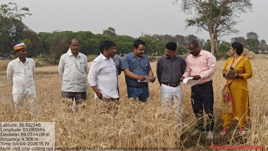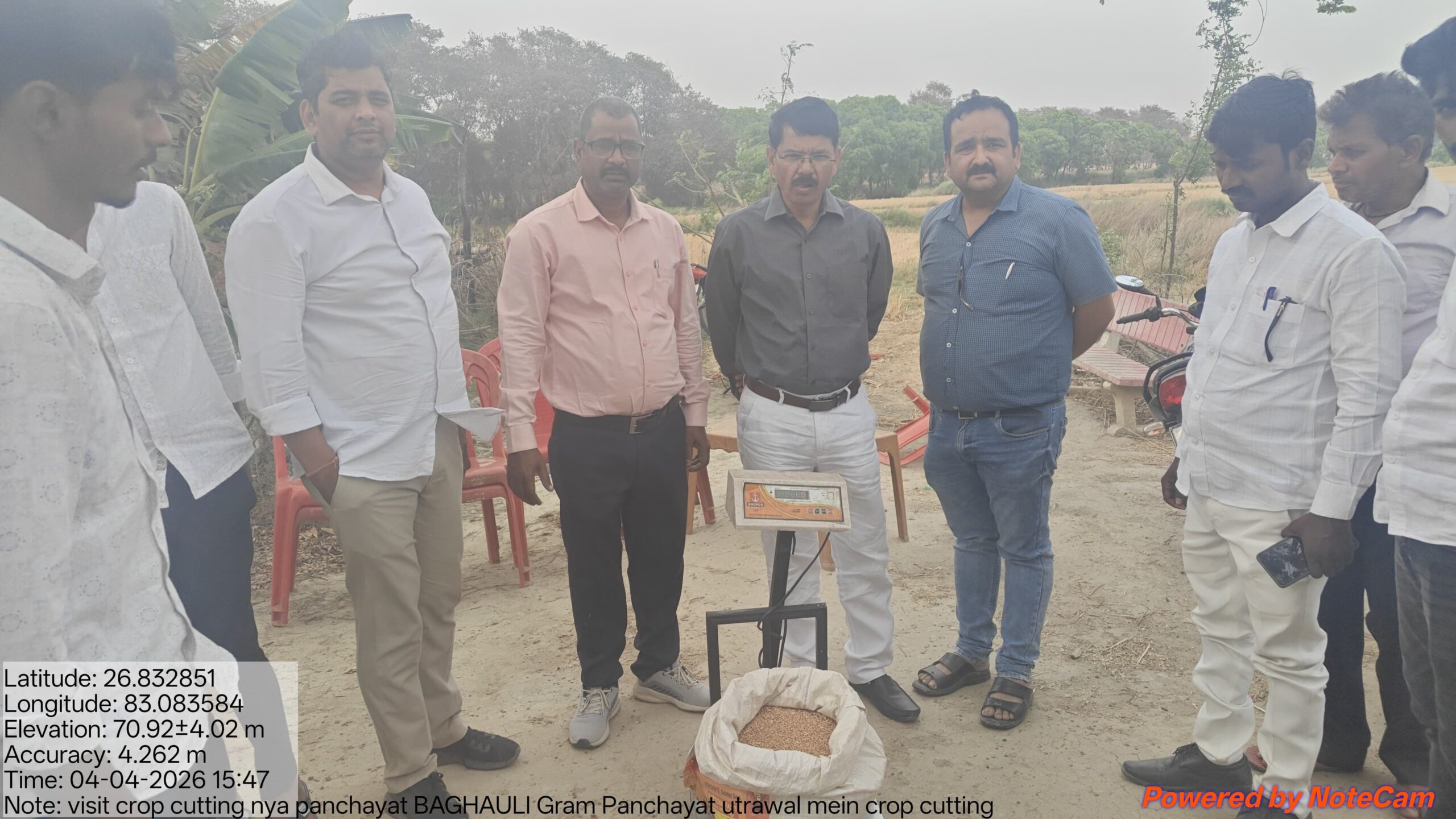 संत कबीर नगर 04 अप्रैल 2026(सू0वि0)। अपर जिलाधिकारी (न्यायिक) चंद्रेश सिंह जी द्वारा तहसील खलीलाबाद के विकासखंड बघौली के ग्राम पंचायत उतरावल में रबी 2025-26 के अंतर्गत चयनित कृषक अनुराग के स्थित गाटा संख्या 272 रबी प्रजाति कर्ण बंदना कटिंग की अधिसूचित फसल गेहूं की कटाई का CCE APP के माध्यम से निरीक्षण किया गया । प्लाट उपज 19.000 किलोग्राम(43.3 वर्ग मीटर में ) प्राप्त हुआ अर्थात 43.89 कुंतल प्रति हेक्टेयर अनुमानित प्राप्त हुआ।