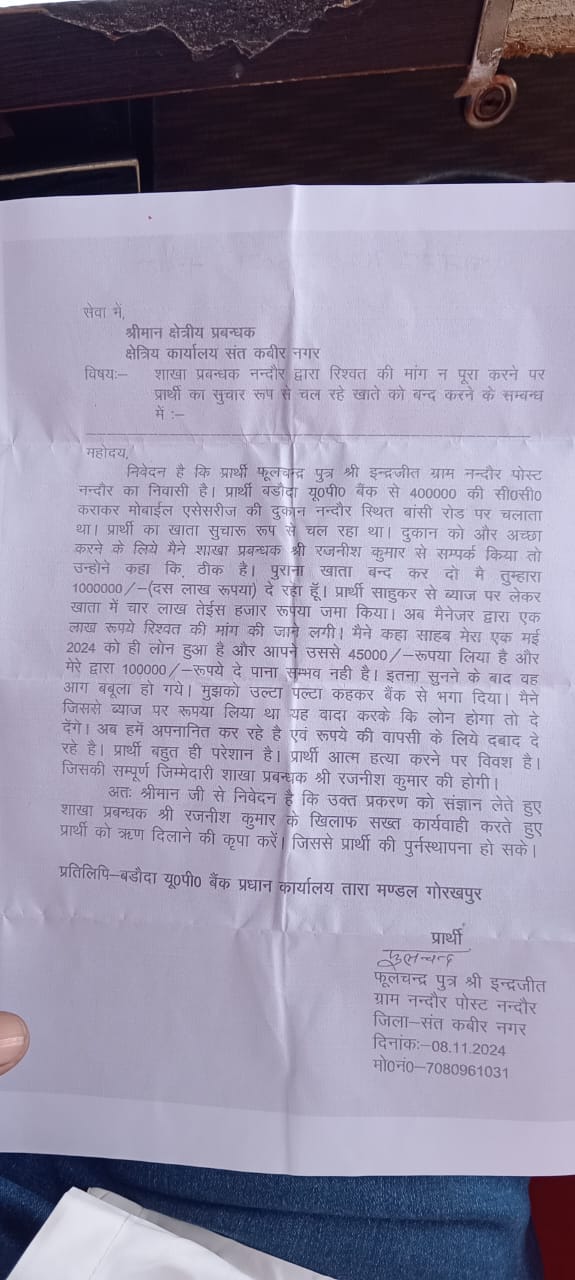 जाँच कर कार्यवायी की माँग बेलहर/संतकबीरनगर स्थानीय क्षेत्र के नन्दौर स्तिथि बड़ौदा यूपी बैंक के प्रबंधक रजनीश कुमार पर रिश्वत...