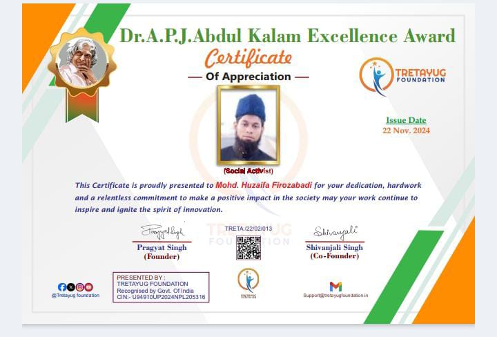 संतकबीरनगर। डा. एपीजे अब्दुल कलाम ट्रेटरी फाउंडेशन के फाउंडर प्रज्ञात सिंह ने मुहम्मद हुजैफा फ़िरोज़ाबादी को डा. एपीजे अब्दुल कलाम...